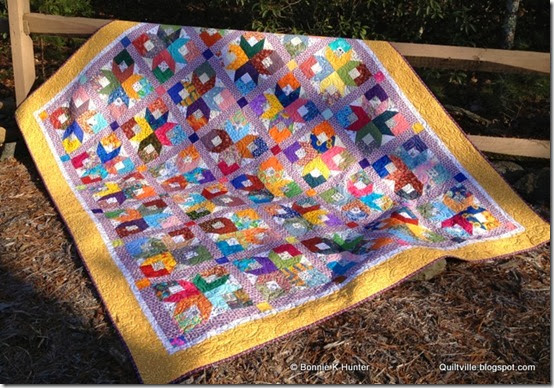 So the next time you make a scrap quilt, dare yourself to mix in some oldies but moldies with your new stuff. Let those old fabrics find a home. Better in a quilt, than still nagging you from the scrap bins! It still needs binding of course, but I needed to post the picture for the two workshops I have coming up!