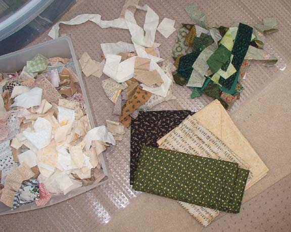 Because I am a scrappy girl and couldn't stand the thought of making a whole quilt out of only 3 or 4 fabrics...out came the neutral and green strips to combine with the "main" fabrics! My thought was that I would make all the 4 patches in the 4 block corners scrappy, and also use scrappy 2" squares as the cornerstone in the block corners. I added one more "common" fabric..a gold for the sashings and the inner star points. The background at the tips of the black diamonds are also from scrappy 2" neutral squares.