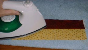 Press your strip set with seam allowance going towards the darker fabric. If you started your sewing with a pair of leader squares, press this open to the dark too, and set it aside to match with another pair to be made into a 4 patch.