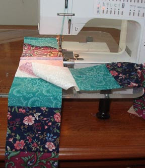 Take one of your pieced units (it will be all connected into a circle-loop). with your seam ripper, simply slip through about every 3rd stitch, and open up the circle into one length of pieced squares.