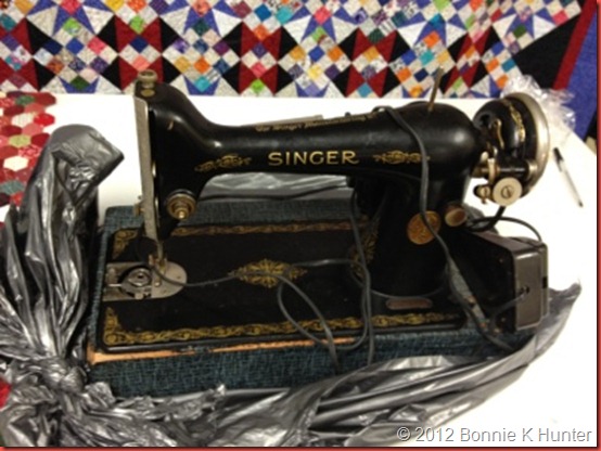 One of my readers who couldn’t be there left this gift for me in the office of the church we were meeting at! I of course quickly named her Gae, and she has sat in my basement waiting her turn to go be rewired ---I already have another machine just like her, she is a Singer 66 with a drop bobbin. The other one was my great grandmother's machine ---which works ----so I wasn’t in a hurry to get the rewiring done.