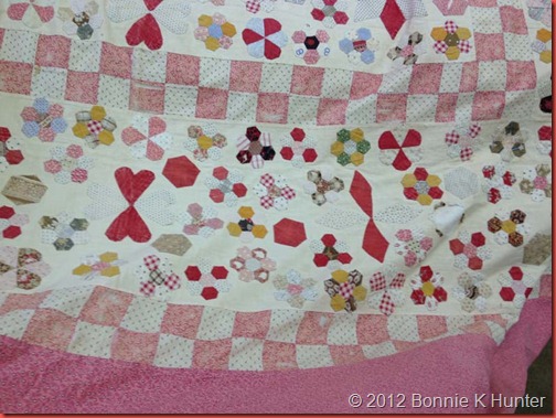 I was very excited to see that the appliques really had no rhyme or reason other than to fill the space. There were little appliqued “heart and gizzard” type motifs as well as hexie flowers and large individual hexies interspersed between 8 pointed stars and 4 hears with points touching.
