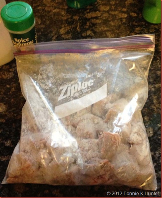 Shake flour, seasoned salt and pepper in a bag. Toss in the beef cubes and shake to coat evenly.