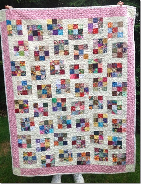 I was making blocks of your dancing nines quilt just for fun but suddenly needed a quilt for my nephew's adopted baby girl. A pink border and quilted hearts with pink thread made it a girl quilt.