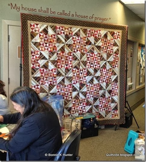 The variations of quilts and color ways were many! We had browns and greens, ,or pinks and brows, or reds and blues, and even though this next photo is from THIS class, it was posted by Charlotte, a former student to our Quiltville Friends facebook page yestderday and I’m including it here as design inspiration….Turquoise and ORANGE! Whoowhooo!