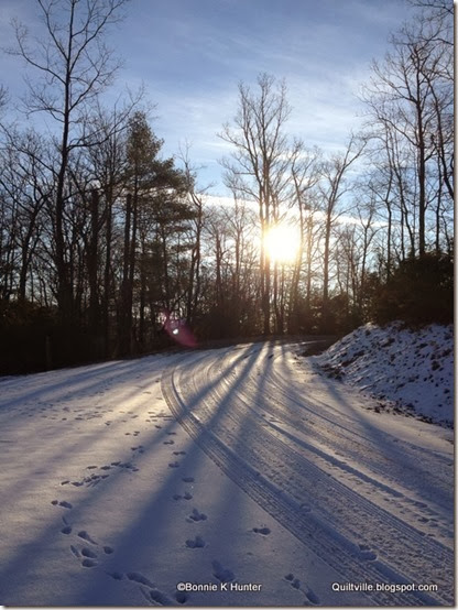 This is this morning’s sunrise view as Sadie and I stepped out for her morning walk before breakfast.  She LOVES the snow….but those are not just HER footprints you see….there are deer tracks as well, and she runs around nose to the ground trying to sniff out all she can about them.