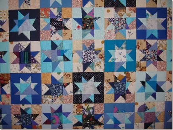 A blue and cream wonky stars, and a charm reels/spools – each spool block has a different fabric from my scraps, I think there are 270.