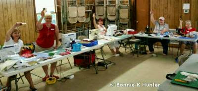 All 24 students bringing in machines, hauling totes, fabric and setting up for a fun day of sewing.