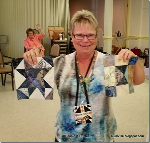 Joyce was also voted “The Best Dressed to Match her Project!” in class---she was sewing with smoky toned batiks, and her blocks totally blend into her shirt as invisible against her.