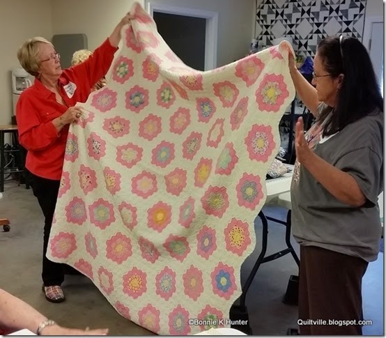 Sandra brought in this one, with its double paths of muslin around each pink rimmed flower. Gotta love those yellow centers!