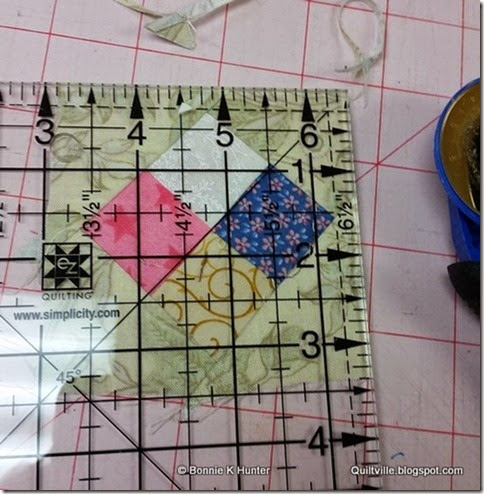 When doing these units, I generally add 1/8” to 1/4" to any cut measurement I am given. These triangles bring quite a bit of bulk at the center of each side where seams will cross seams and that can give a bigger “press over” seam height, shrinking your unit. SO if a pattern says “cut a square 2 3/8” once on the diagonal” I will up that to 2 1/2” just to give me a bit of wiggle room.