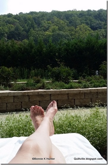 And yes. I did bring hexies with me. And yes. I stitched a few. Very few. Because after that soak and that massage about the only thing I could do was close my eyes and dream –and probably snore and drool too, but it didn’t seem to bother the bees buzzing on the nearby flowers.