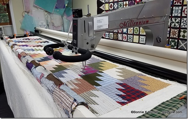 I had originally planned on a blue…but the more I quilt this and advance it in the machine and quilt it some more…that brown was just calling to me so I dug into my DEEP stash and found just the right amount of a brown gingham left from 1990 something….plaids never go out of date, right?  It’s perfect for this quilt and is ready to go as soon as the quilting is done.  It’s about half way right now.