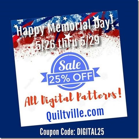 While you are enjoying a lovely long weekend, (And I hope you are!) I am giving you the heads up that ALL DIGITAL PATTERNS in the Quiltville Store are 25% off through Monday when you use the coupon code DIGITAL25 in the coupon box when ordering.
