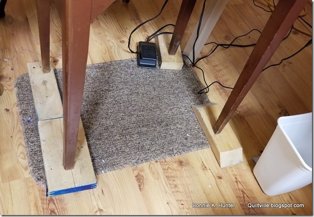 This cabinet sits shorter than the cabinet my 301 is in. And the legs are closer together. A quick trip to the construction area around the “Man Shed” gleaned 4 pieces of scrap lumber to place under the legs and get the machine up to where this tall girl needs it.