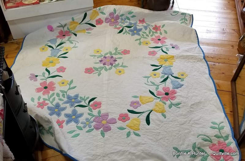 Applique kit quilts became popular in the 1920s and were available all the way through the 1970s through mail order catalogs. The fabrics came printed with the outline of the pieces. Simply cut out the pieces and applique them down to the base fabric also marked with the ever-present blue placement lines.