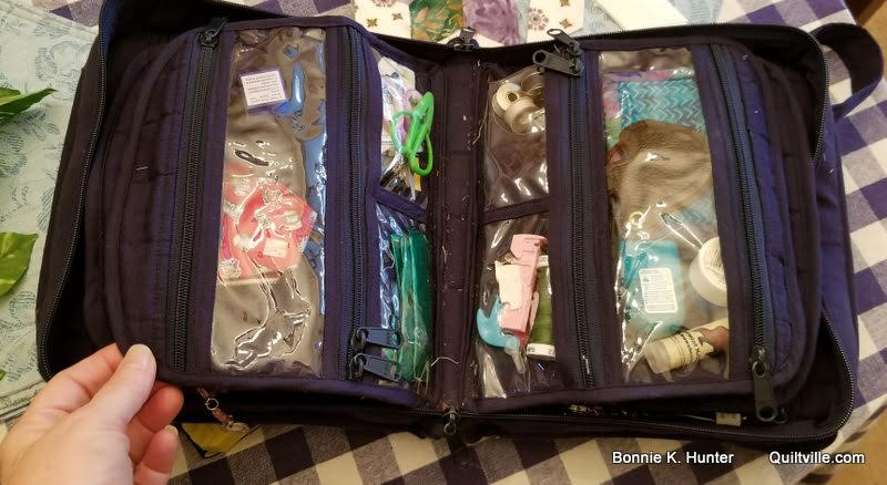 I also keep ear plugs and a sleeping mask in here for overseas flights as well as gum for ear pressure. And even after all of that – there is still plenty of room for my handwork project – fabric diamonds, paper diamonds, threads, snips, needle threader, needles, wonder clips, thread conditioner – and lip balm, hand lotion and Listerine spray.
