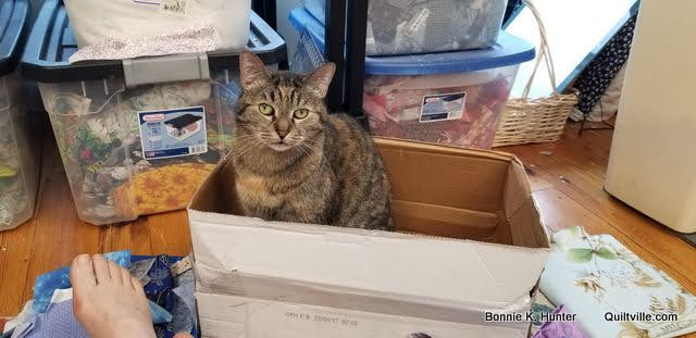 Saturday morning I arrived at Quiltville Inn to find 3 large boxes of scraps had been placed on the front porch – a delivery made by USPS, sent from a friend who knows that fabric therapy is good for my soul – and my creativity!