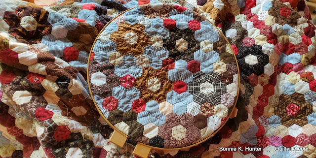Baptist fans are so easy to quilt because the curved lines, quilting toward you, are long and graceful and easy. Quilting by the hexie means short needle loads and much turning of the hoop and readjusting of the bulk of the quilt in my lap.