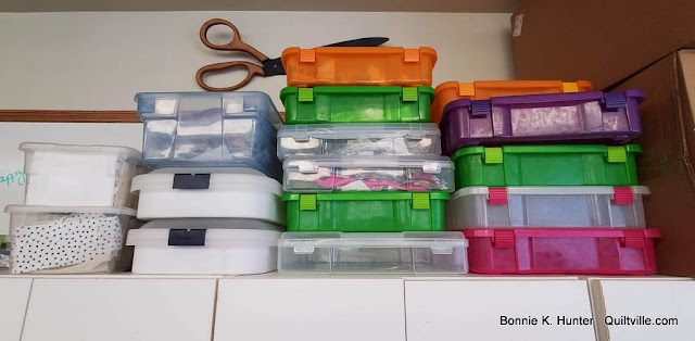 Project bins are stacked on top of my stash cabinet at the QPO Studio. - and I'm happy to say that at least half of them are empty.