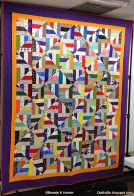 Virginia Bound is the flagship quilt from my book "Scraps & Shirttails". Based on the traditional Rocky Road to Kansas block, I have revamped it for foundation piecing! Even the setting diamonds are string pieced. :c) A wonderful border surrounds the quilt. I made this quilt using all the 'strings' and small parts left from cutting up recycled shirts to use in quilt making. It's a FUN class, no matter what fabrics the students choose. Simply go all scrappy, by separating lights from darks, or choose a two color scheme such as blues/yellows, or reds/greens for a gorgeous christmas quilt.